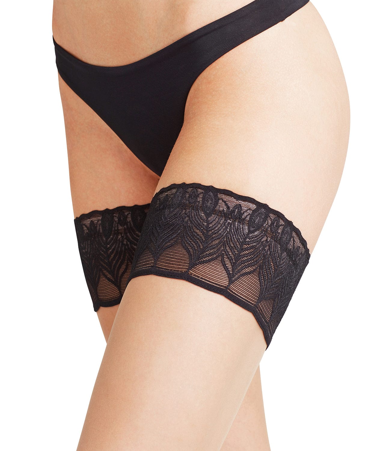 Ultra-transparent stay-ups that lend your legs an elegant shimmer thanks to their soft texture. The beautiful decorative lace with a peacock feather pattern gives you a seductive feeling of well-being. Silicone coating makes it absolutely non-slip. Please do not moisturise your legs. 8 DEN appearance.